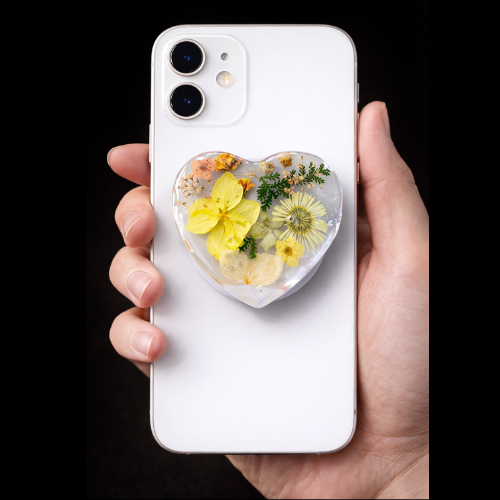 Brighten your everyday carry with this handmade heart-shaped phone grip, featuring real pressed yellow flowers...