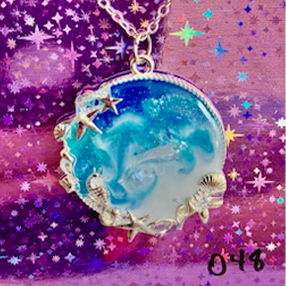 This unique necklace features a round, ocean-themed resin pendant in shades of blue and white,...