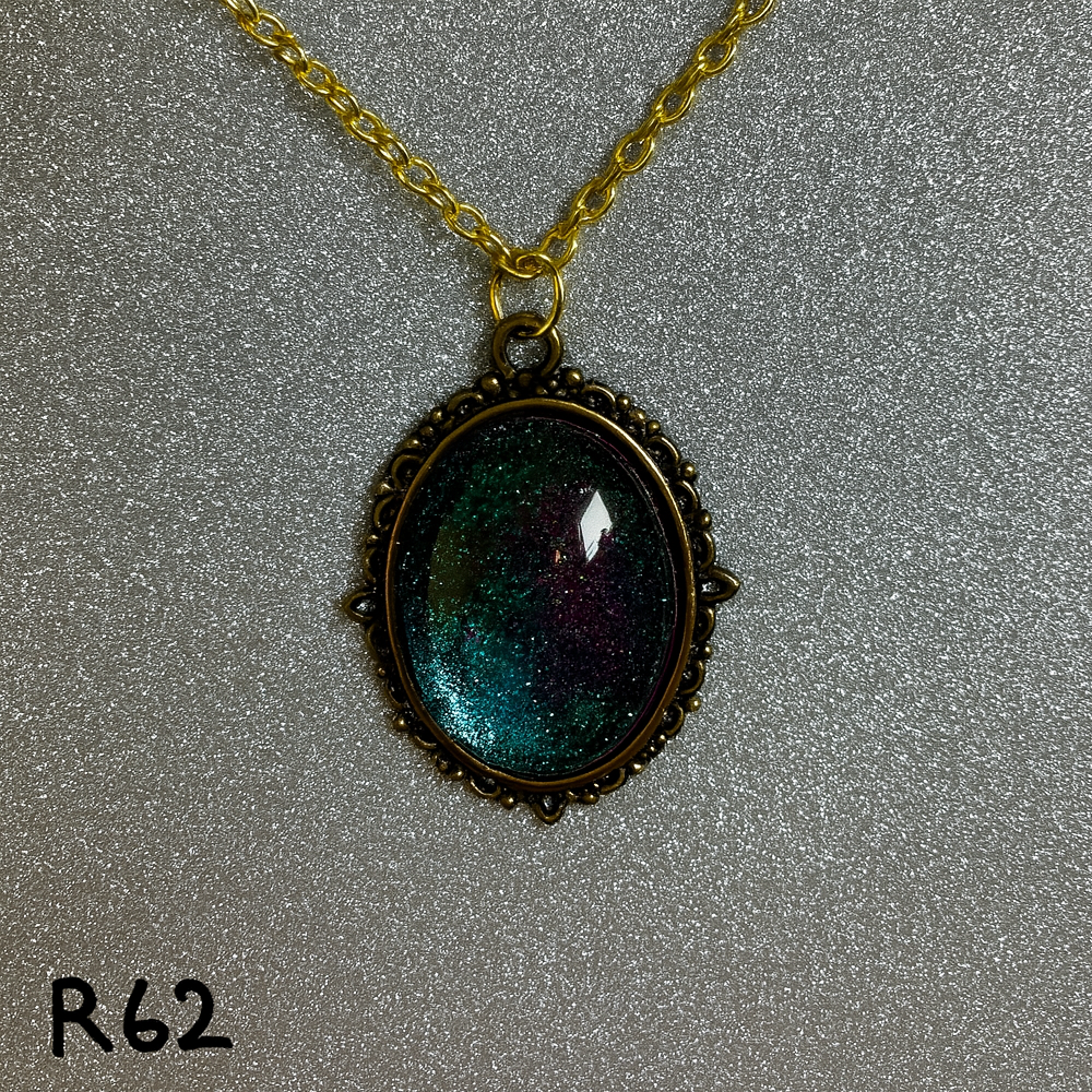 This charming oval pendant features a mesmerizing resin cabochon that beautifully blends sparkling colors. The...