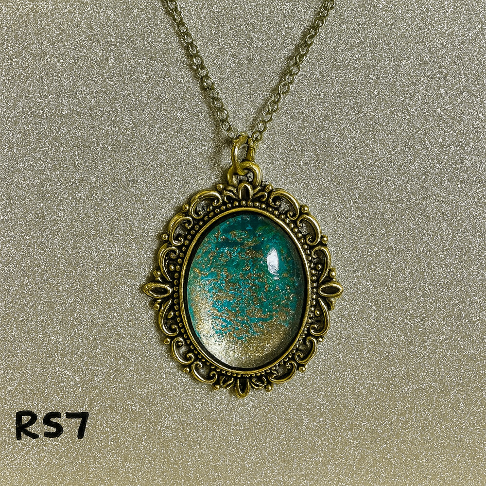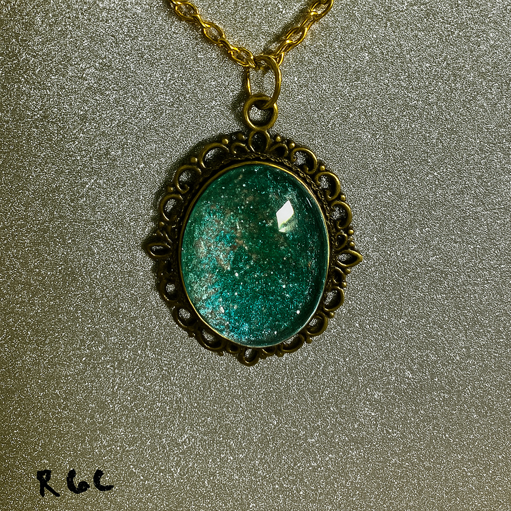 Teal Glitter Resin Cabochon Pendant in Ornate Bronze Setting R66