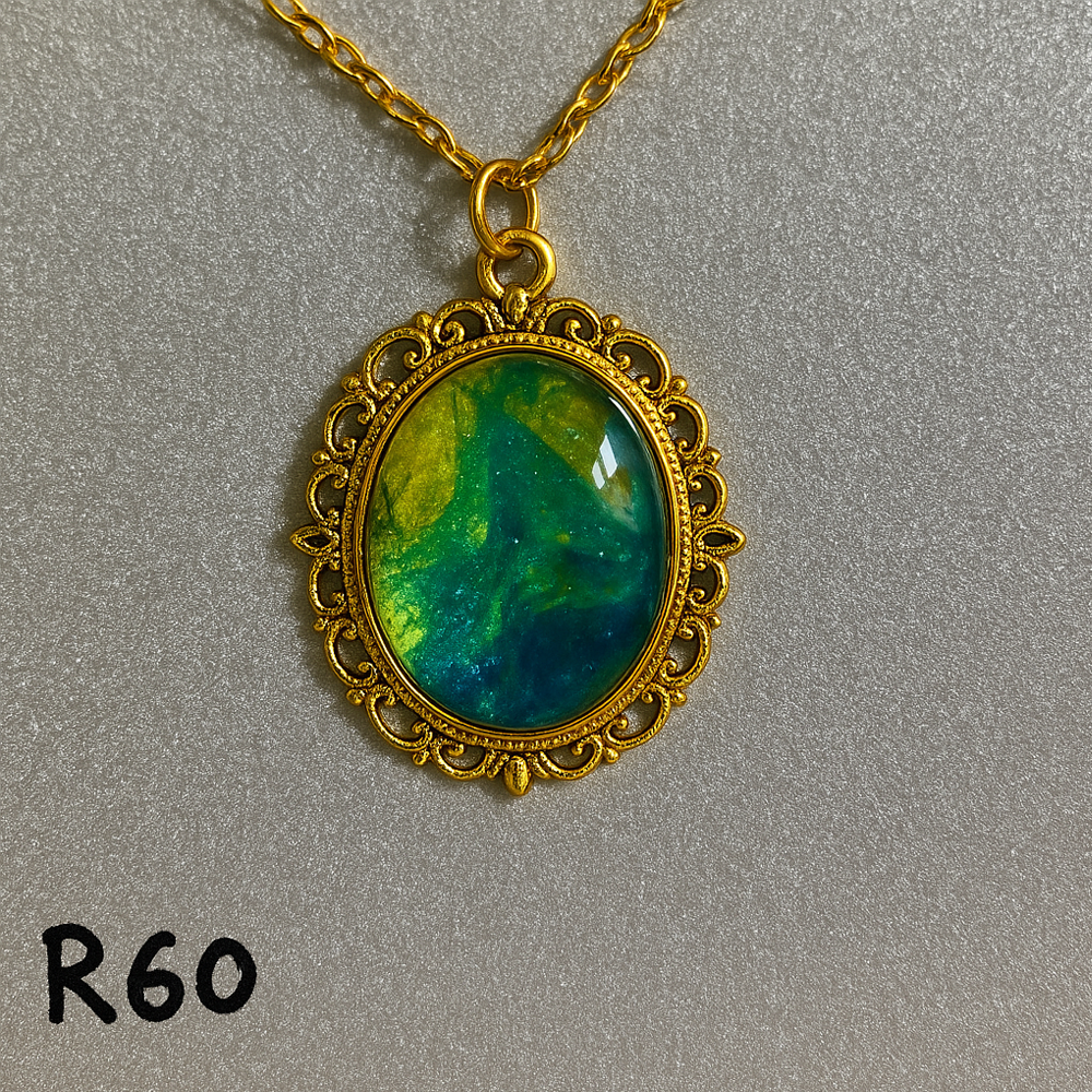This striking oval pendant features a mesmerizing resin cabochon with a clear, beautiful gradient effect....