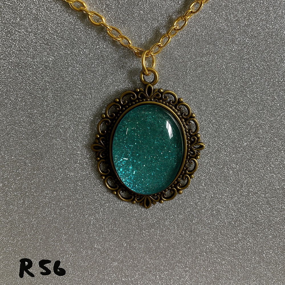 Deep Emerald Teal Glitter Resin Pendant in Ornate Gold Setting R56
