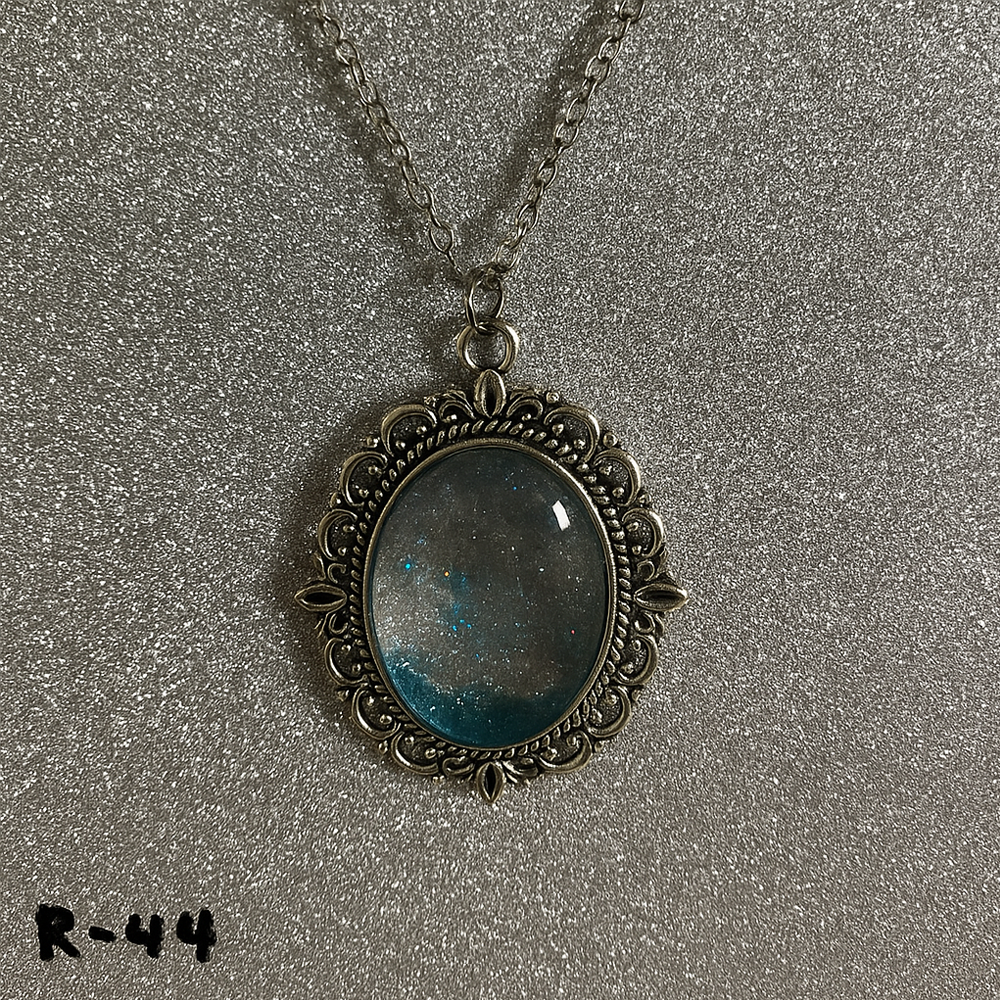 Glittering Frost and Teal Ocean Resin Pendant in Silver Filigree R44