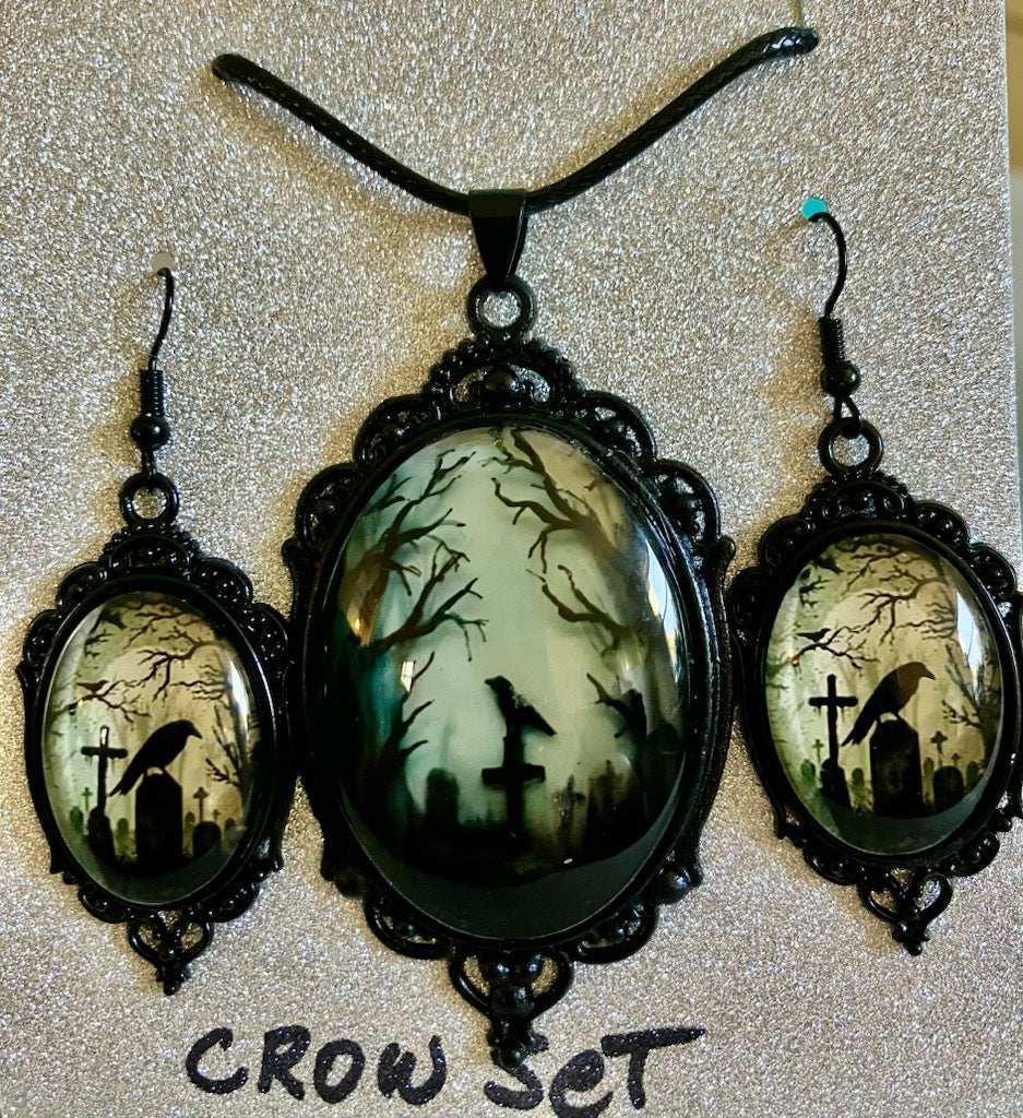 Gothic Graveyard Crow Pendant Necklace & Earring Set - Spooky Halloween Jewelry