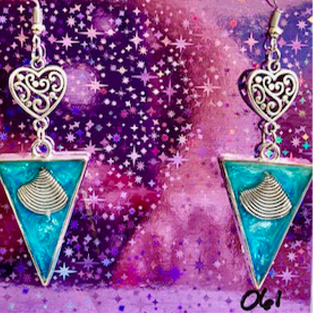 Teal Resin Seashell Triangle Dangle Earrings (061)